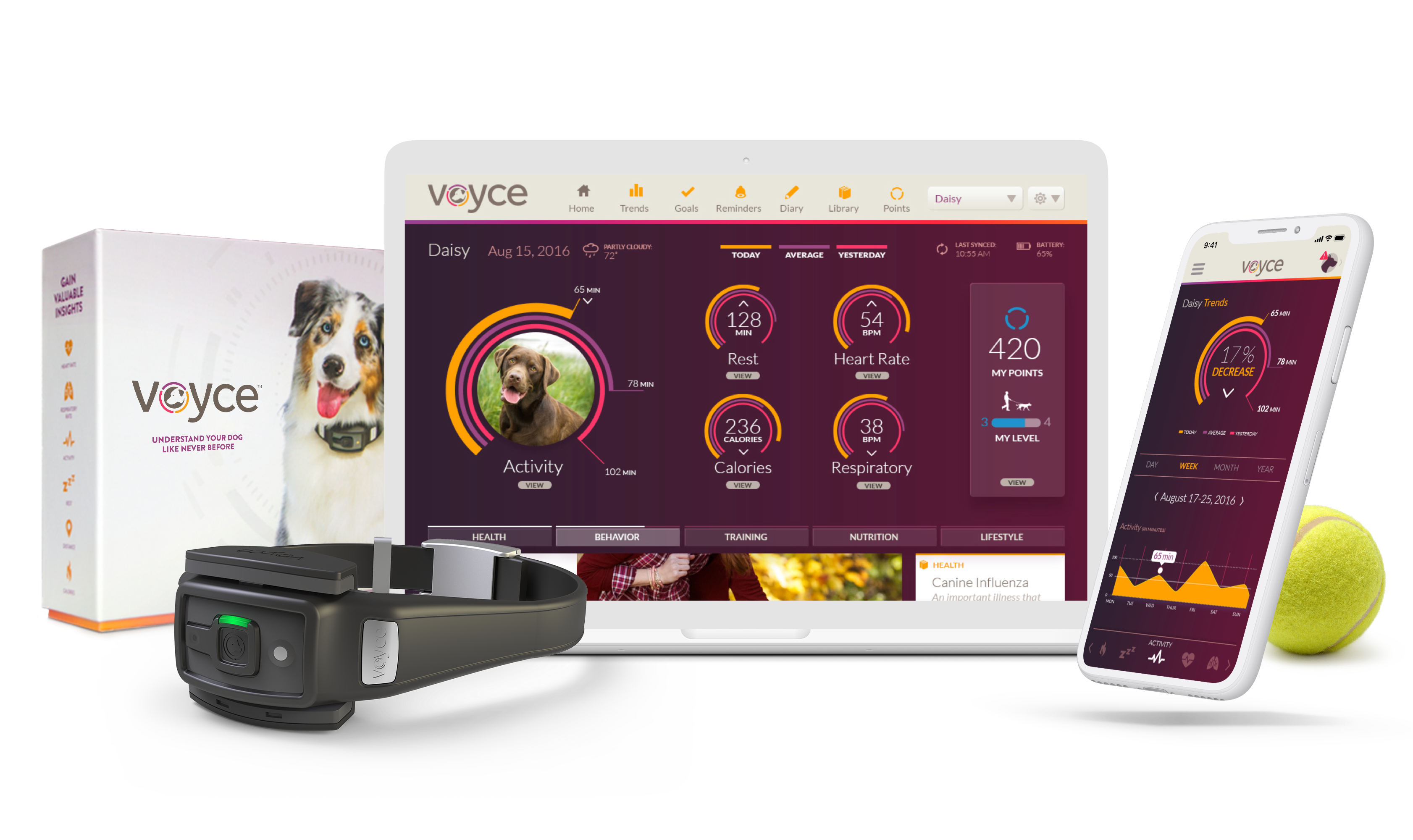 The Voyce wearable band is just the beginning. The real value comes in the form of trending data and insights, as well as tailored articles and advice. We also designed the app’s member area, which helps users track trends in their dogs’ health, learn more about their dogs, and keep track of important information.